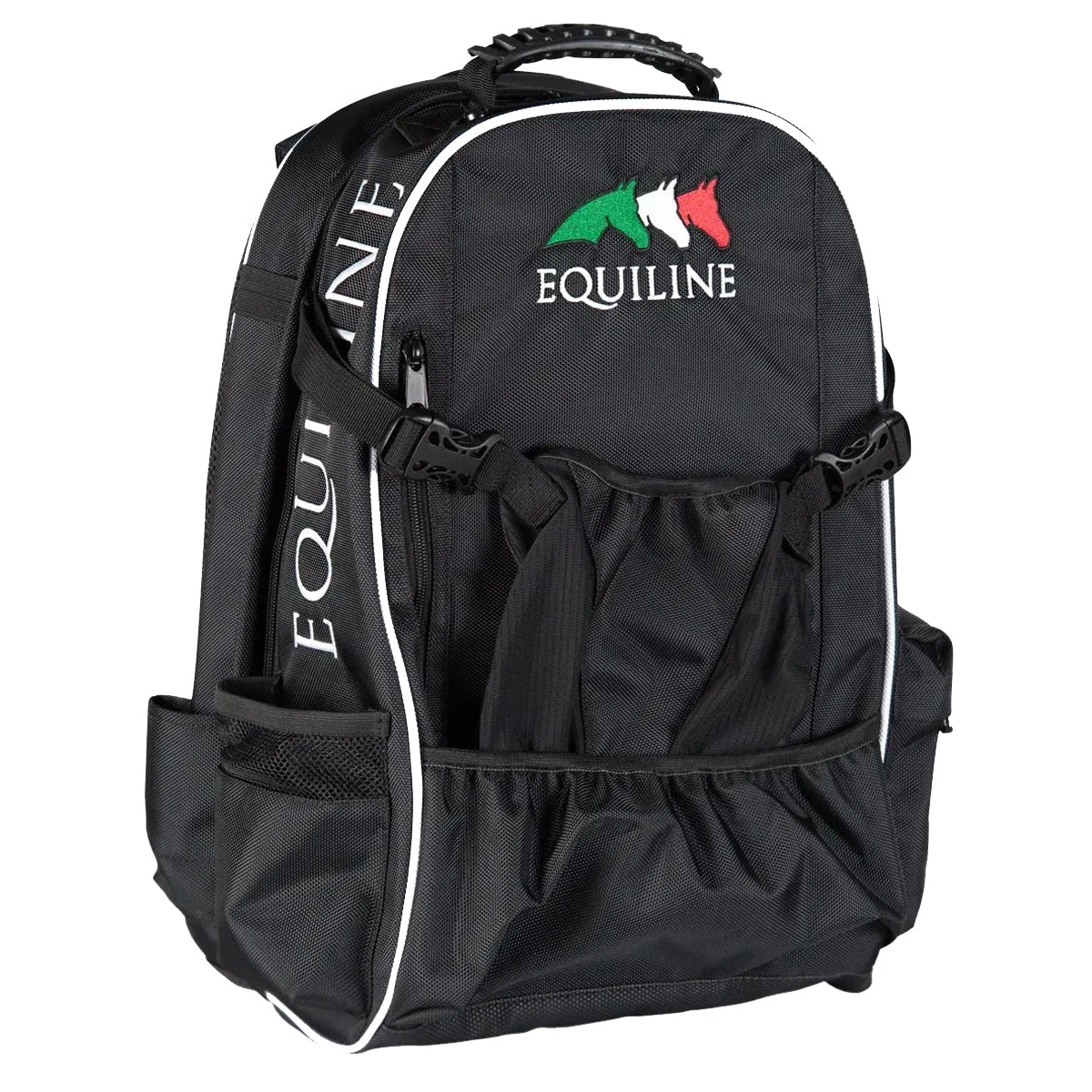 The Nathan riding equipment backpack zips open to two large sections; a suitcase-like section and a mesh zip section, ideal for a change of clothes after showing. Made in sturdy nylon the Nathan backpack can handle the horse show lifestyle. Embroidered with the Equiline Italian flag logo.