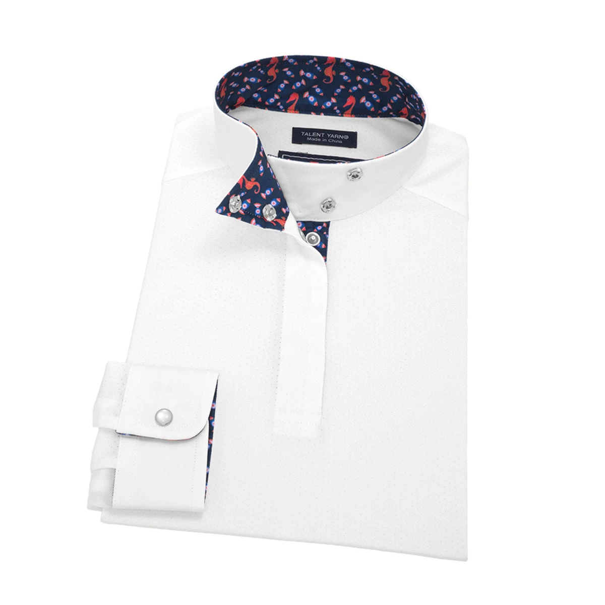 We love this shirt because of the classic white styling, coupled with cute fashion graphics on the inner collar & sleeves.  Show up, show out, & stand out at the show in this stylish shirt from Essex Classics. Â