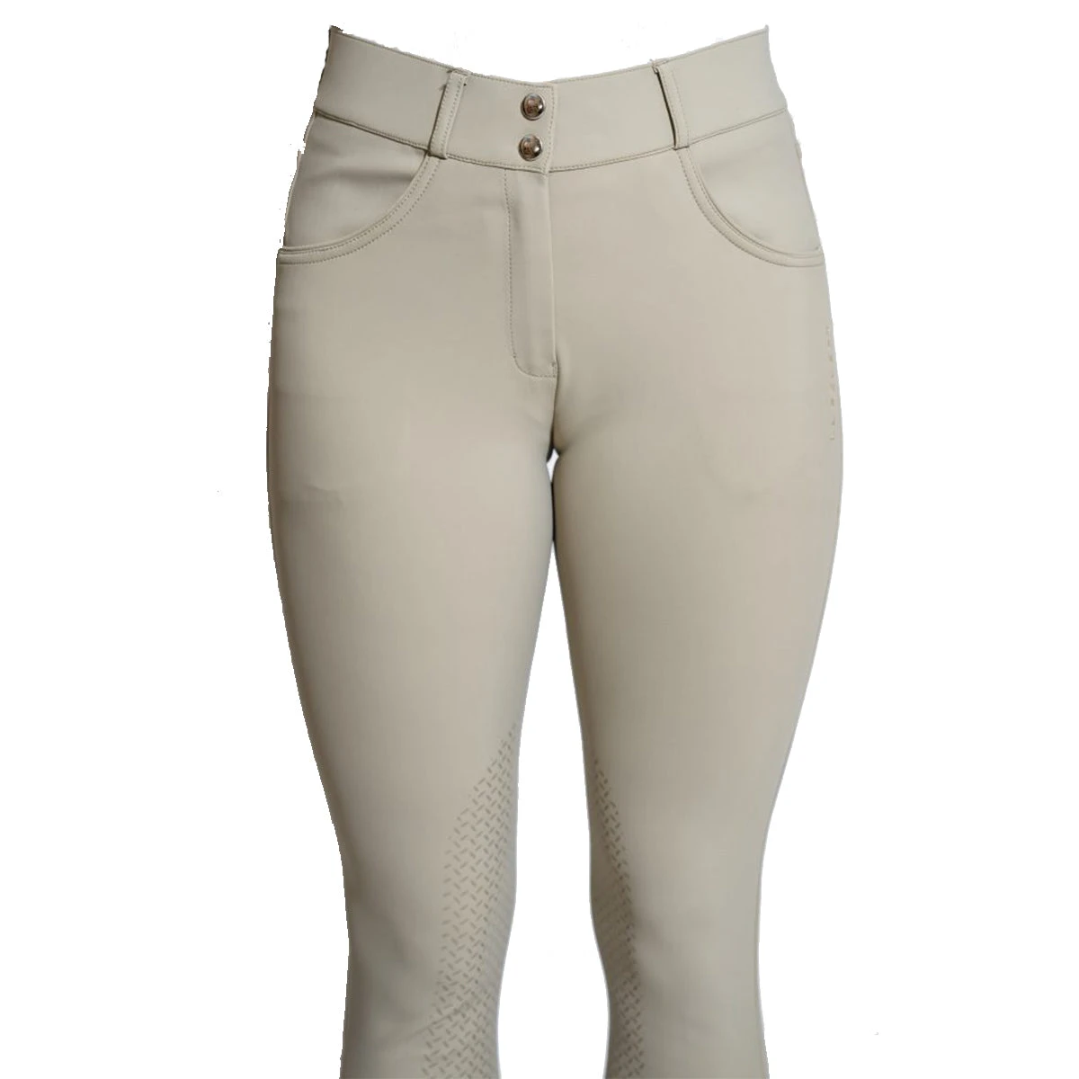 The new Gabrielle Breech features high-tech compression fabric with 4-way stretch for optimal movability and a sleek figure-flattering look! The mid-weight material offers breathability, moisture absorption, and fast drying. The Gabrielle’s features include two front slide in pockets accented by silver grommets, two decorative back zipper pockets, contrasting piping, a silicone full seat, and Lycra sock bottoms.